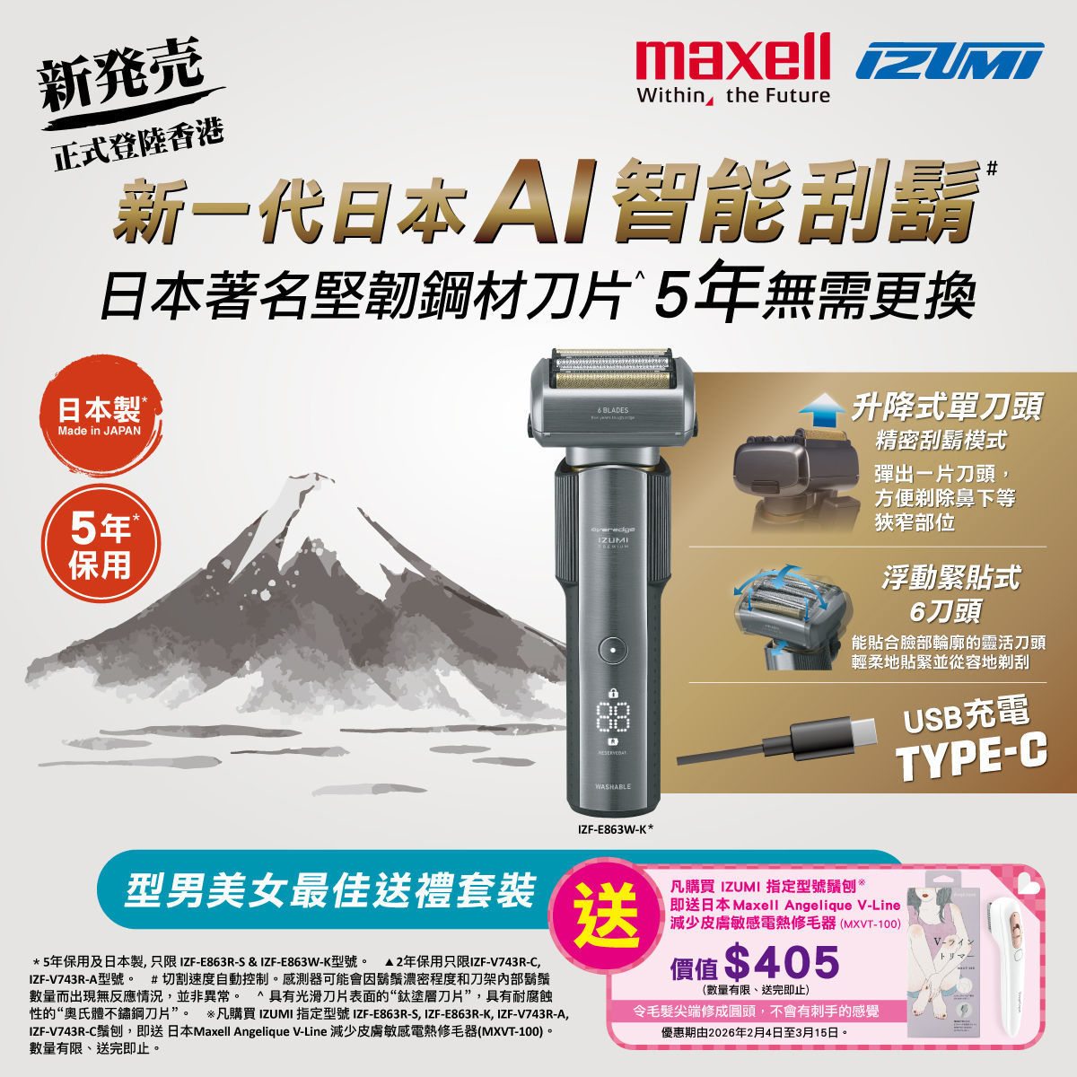 * 送日本 Maxell Angelique V-Line 减少皮肤敏感电热修毛器 MXVT-100 (1个) 价值$405,令毛发尖端修成圆头,不会有刺手的感觉赠品有限。优惠期由即日起至2026年3月15日。赠品有限,送完即止。如有任何争议美星有限公司保最终决定权。